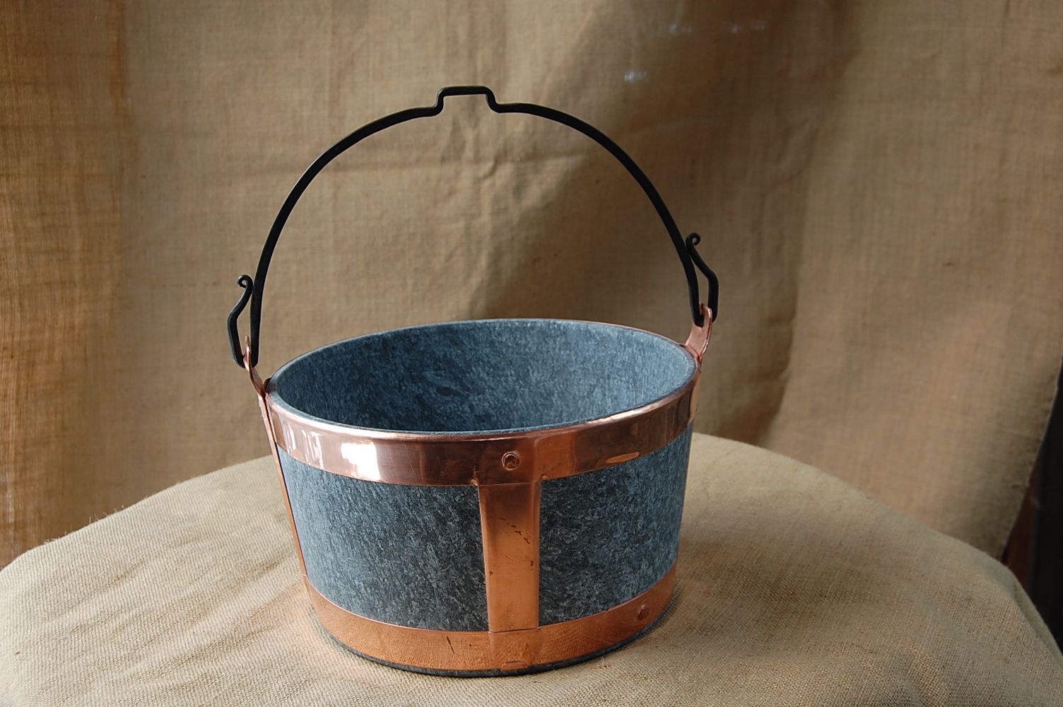 Pentola in pietra ollare “Lavecc”con cerchiatura in rame e manico in ferro battuto (senza coperchio). Tipo di lavorazione: Tornitura a mano con tecniche datate al 1° secolo d.c. Diametro cm 30 h cm 15